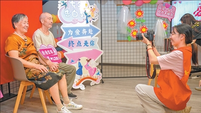 8月26日,浙江省湖州市长兴县明珠路社区联合社工志愿者开展“爱在七夕 情暖夕阳”主题活动,邀请社区20余对金婚、银婚夫妻参与。图为志愿者为参与活动的夫妻拍摄合影。