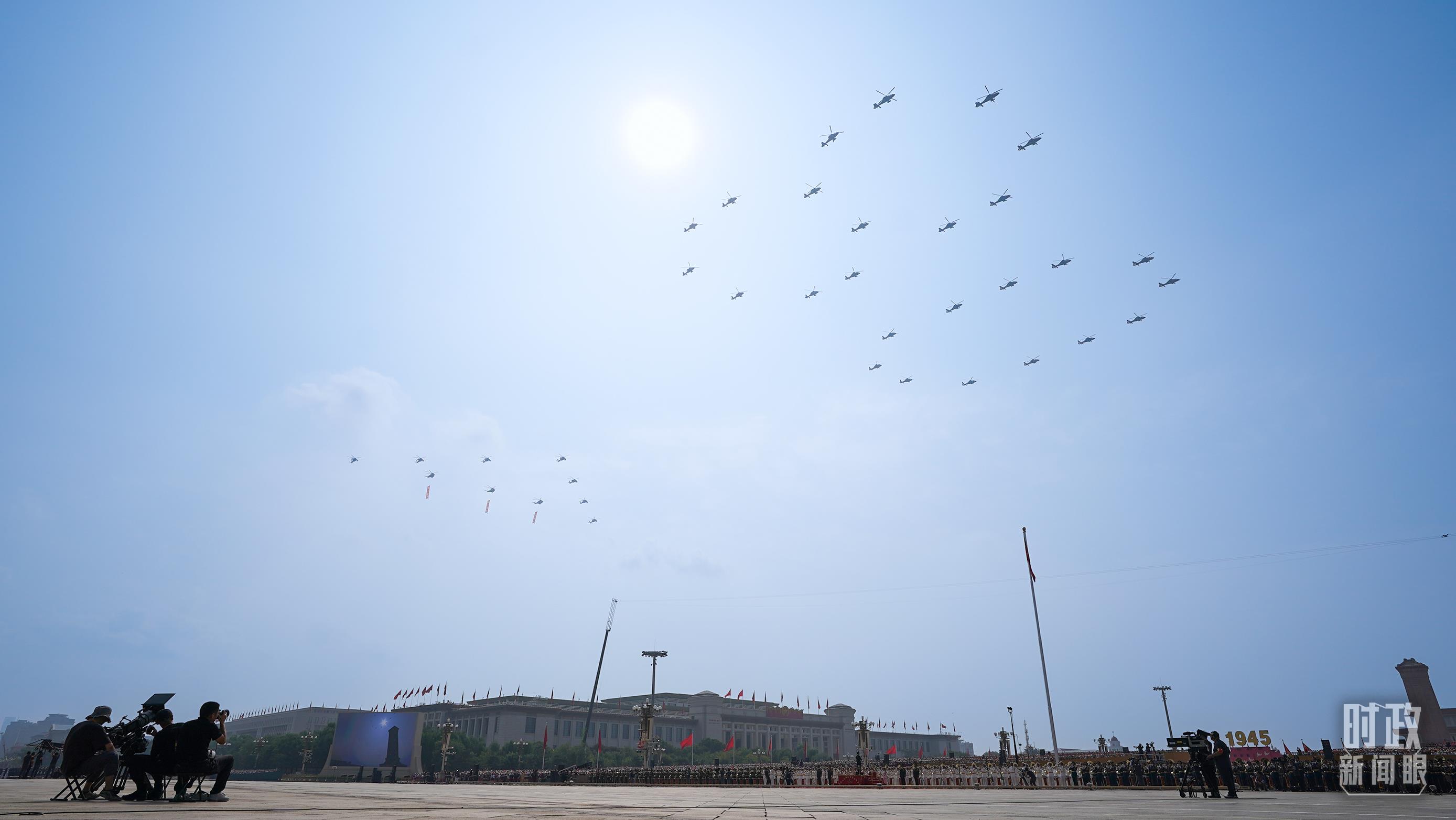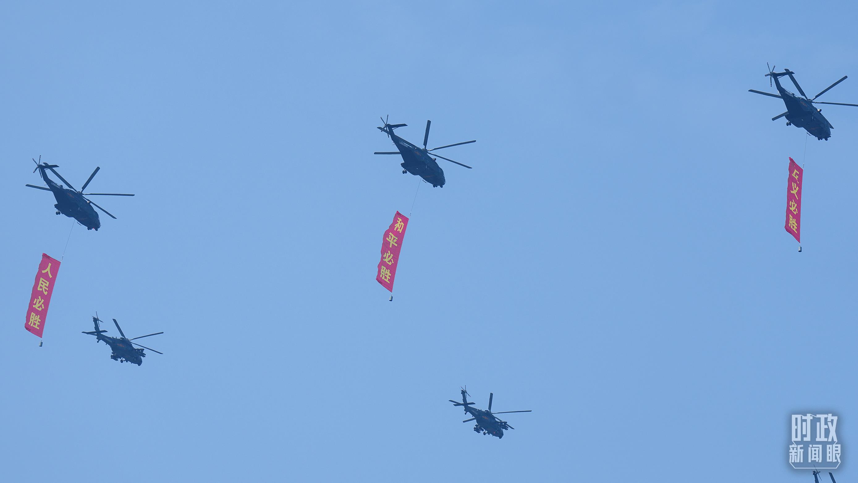 △9月3日,3架直升机分别悬挂“正义必胜”“和平必胜”“人民必胜”条幅飞过天安门广场。(总台记者李晋拍摄)