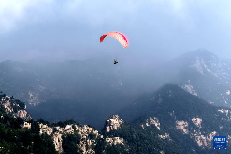 9月14日,在山东省临沂市沂蒙山银座天蒙旅游区,游客在教练的陪同下体验低空滑翔飞行(无人机照片)。