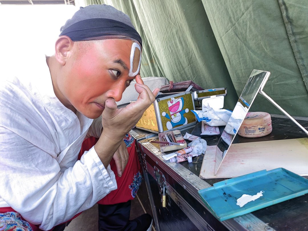 “啊啊啊、咿咿咿……”10月1日上午7时许,秋日的清晨还裹着几分凉意,在菏泽市曹县南湖人民广场临时搭建的化妆间里,曹县剧团演员丁天佑正坐在镜前忙着勾描油彩,嘴里的唱腔却没停——从婉转的小腔到高亢的甩腔,为即将开演的“一元大戏”开嗓预热。