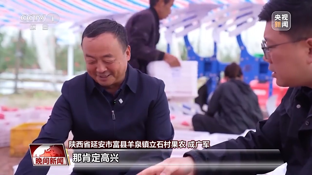陕西省延安市富县羊泉镇立石村果农 成广军:我原来想着总共能卖上13万块钱,就是一颗苹果卖一块钱就行了。现在卖下来,一颗苹果三块钱,那肯定高兴。