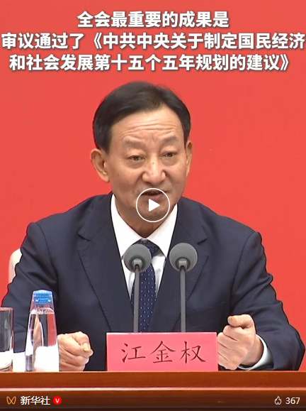 中央政策研究室主任江金权在中共中央10月24日举行的新闻发布会上说,党的二十届四中全会最重要的成果,是审议通过了《中共中央关于制定国民经济和社会发展第十五个五年规划的建议》。《建议》的起草是在党中央领导下进行的。习近平总书记亲自担任文件起草组组长,亲自擘画、全程指导、把脉定向,发挥了决定性作用。