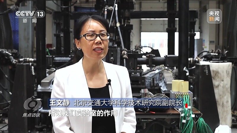 北京交通大学科学技术研究院副院长 王文静:我们实验室是结构强度实验室,作用就是检测高速列车上的这些结构件,筋骨是不是足够强壮。我们实验室发明一个相当于能够模拟气动载荷试验装备,进行了1000万次疲劳试验,试验的结果充分证明了我们的设计满足400公里高速运行需求。