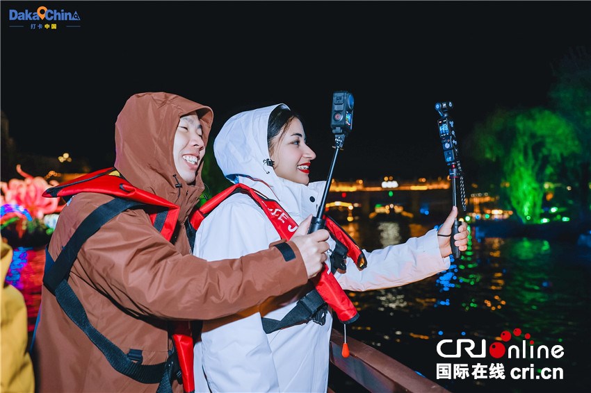 晚上的汴河两岸,光影交织,桨声四起。采风团乘船游览,看古城夜景与国潮演绎完美融合,不禁连连称奇。