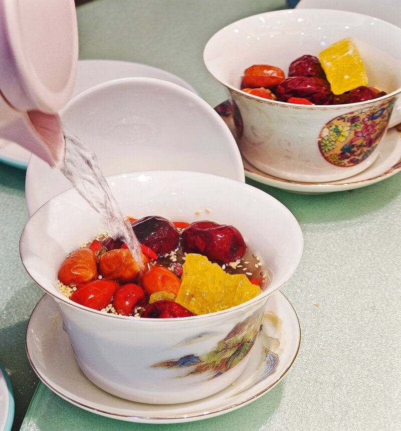 八宝茶在盖碗中徐徐舒展,枸杞、红枣、桂圆、芝麻、核桃、葡萄干、苹果片与茶叶相互交融,这是千百年来饮茶习俗不断演变的结晶,更是吴忠人待客之道的生动体现。