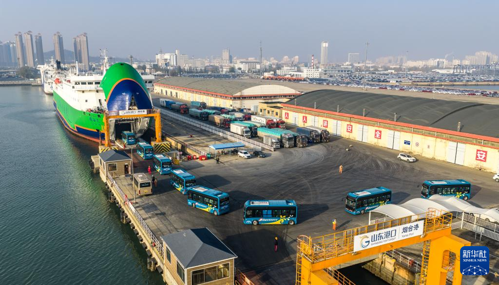 11月30日,一批全新的纯电动公交车在山东港口烟台港登上新能源汽车运输船“绿安达”轮,跨越渤海海峡前往辽宁大连,交付大连交运集团(无人机照片)。新华社发(张超摄)