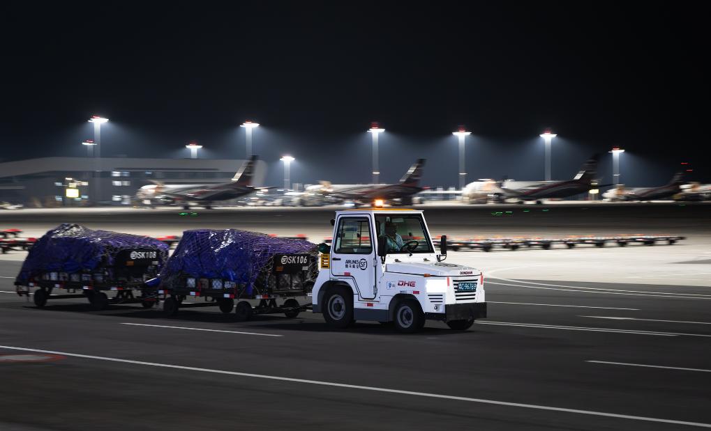 每天凌晨1点到5点,来自五洲四海的货物在花湖机场集结,经过中转分拣后再运至全国各地,货机在此停留不超过4个小时,期间需完成卸货、分拣、装货等多项作业。如何高效完成中转任务呢?