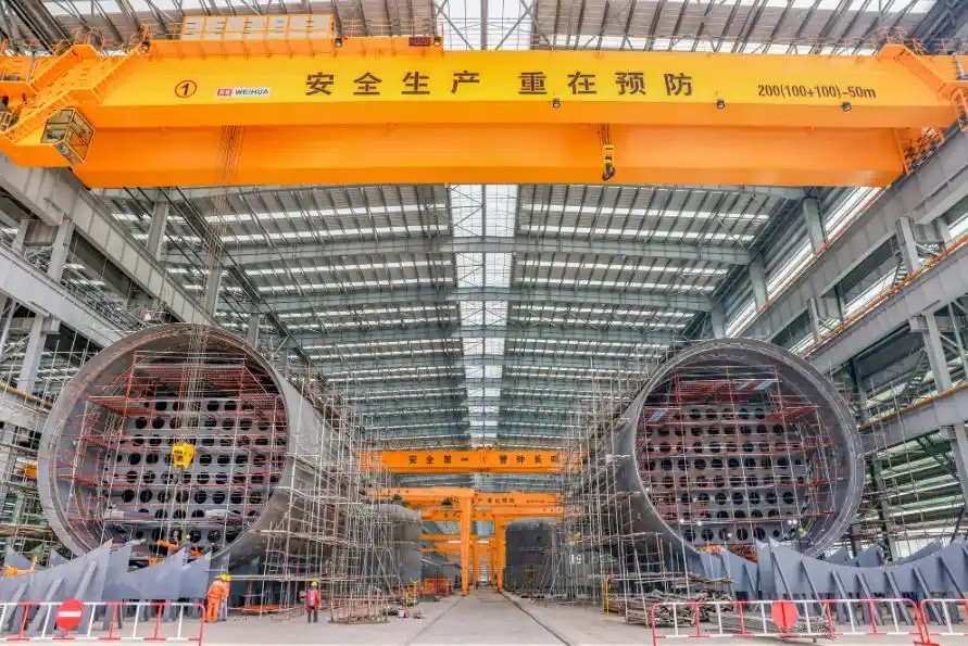 新时代造船交付的国内首艘甲醇双燃料9000TEU集装箱船,标志着泰州市在清洁能源船型领域实现突破;扬子鑫福为法国达飞海运集团承建的首制24000TEU双燃料动力集装箱船,是全球最先进的绿色船舶之一,与传统燃油集装箱船相比,二氧化碳排放量减少约20%,硫氧化物和颗粒物排放量减少99%。新时代造船建成国内最大单体智能化分段车间(480米长),提升平面分段效率30%,将巴拿马型散货船建造周期从2年缩短至8个月。