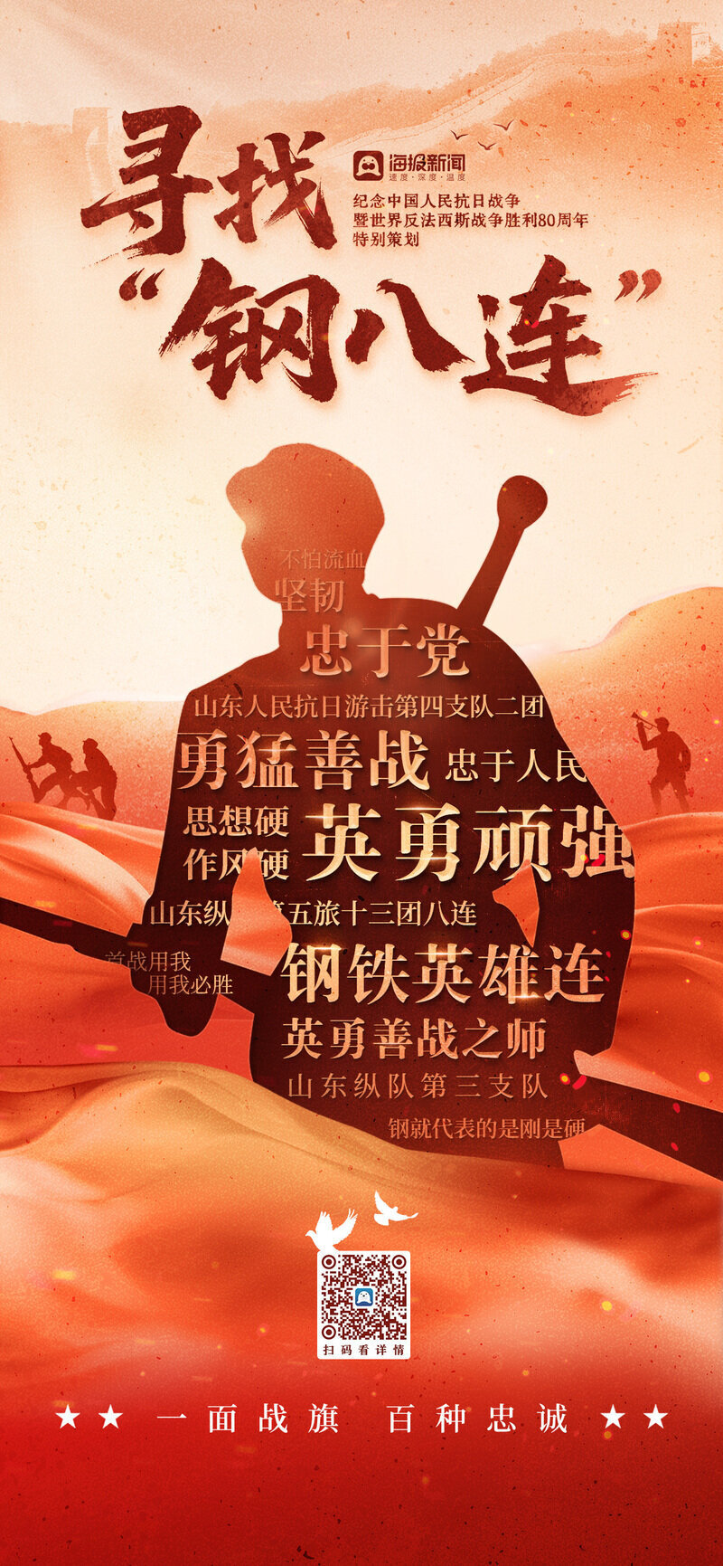 阅兵式上,一面由“胶东军区”授予的“钢八连”荣誉旗帜,引起了我们的注意。