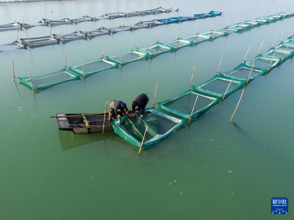 1月15日,东平街道蟹农在蟹池内劳作(无人机照片)。新华社记者 朱峥 摄