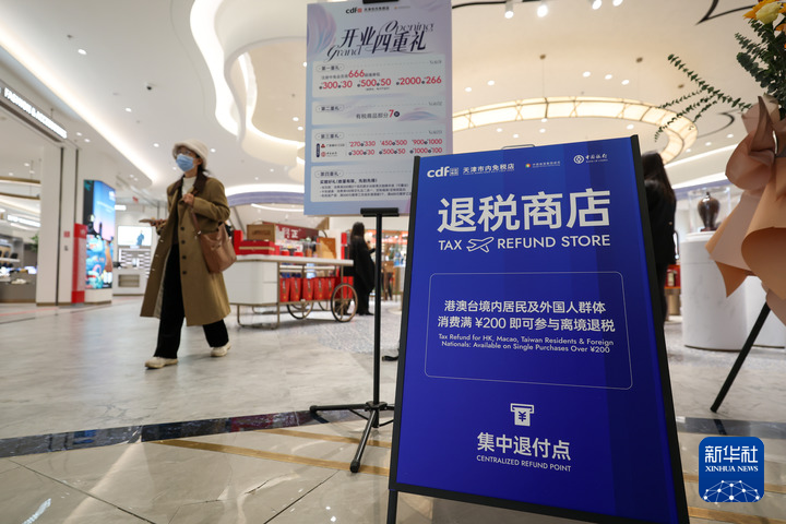 2025年11月28日在天津市内免税店拍摄的退税商店集中退付点标牌。新华社记者 孙凡越 摄