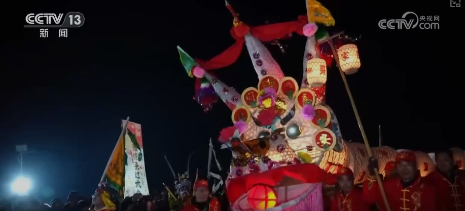 随着天色渐晚,村里最隆重的庆祝活动东泉马灯、张家龙灯伴随着锣鼓声,依次登场。张家龙灯已有500年的历史,现场近百人组成的龙灯团队声势浩大。