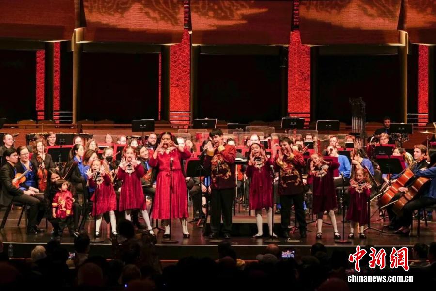 当地时间2026年2月15日,第七届“春之声”中国新年音乐会在美国纽约林肯中心爵士乐中心玫瑰剧场举行。图为来自美国的儿童用中文表演歌曲串烧。 中新社记者 王帆 摄