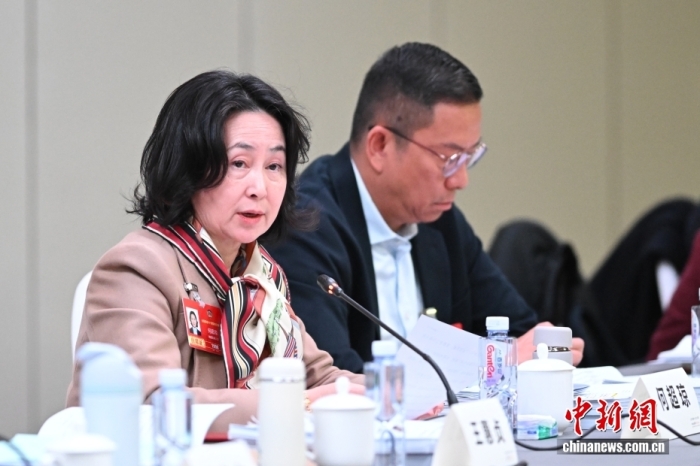 3月5日下午,全国政协十四届四次会议特邀香港人士界别小组会议在北京举行。图为全国政协委员何超琼(左)在会上发言。中新社记者 田雨昊 摄