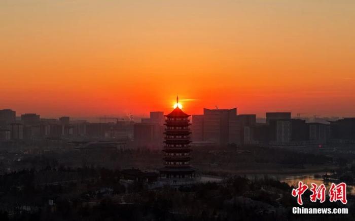 雄安悦容公园日出景色。中新社发 胡忠 摄