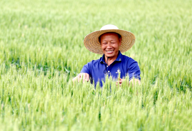 5月5日,山东省临沂市郯城县郯城街道陵坡村村民在田间查看小麦长势。 5月8日将迎来“世界微笑日”。微笑是无声的问候,微笑是人类最