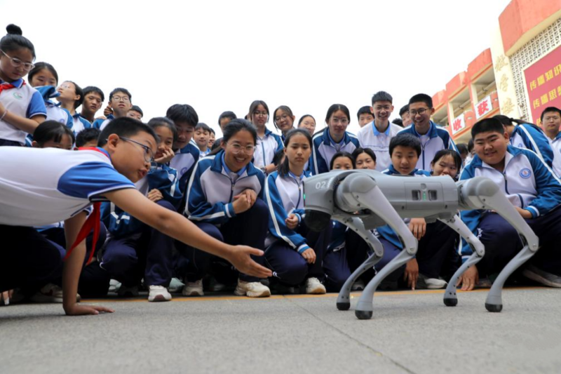 5月7日,在河南省济源市轵城镇校园科技节活动上,同学们与机器狗互动。 当日,河南省济源市轵城镇举办以“智创未来,筑梦乡村”为主