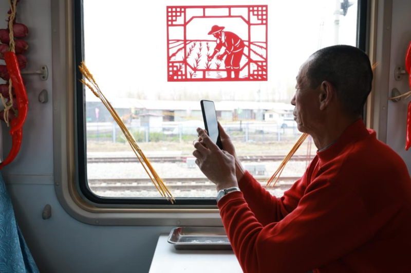 5月7日,乘坐K5161次“插秧专列”的“插秧客”在拿手机记录窗外景色。 当日,黑龙江省齐齐哈尔市始发的K5161次“插秧专列”,载上各