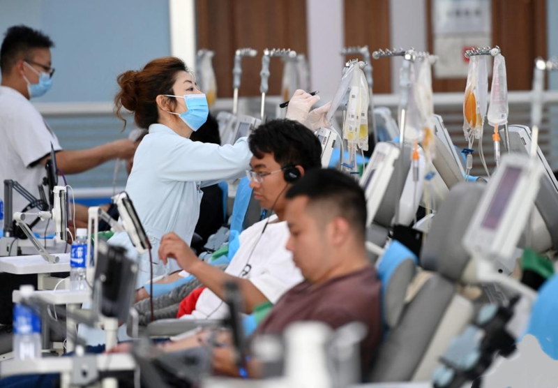 5月7日,在天津市血液中心,护士查看献血者的状态。 世界红十字日来临之际,天津市血液中心开展活动纪念天津市无偿献血志愿服务大队