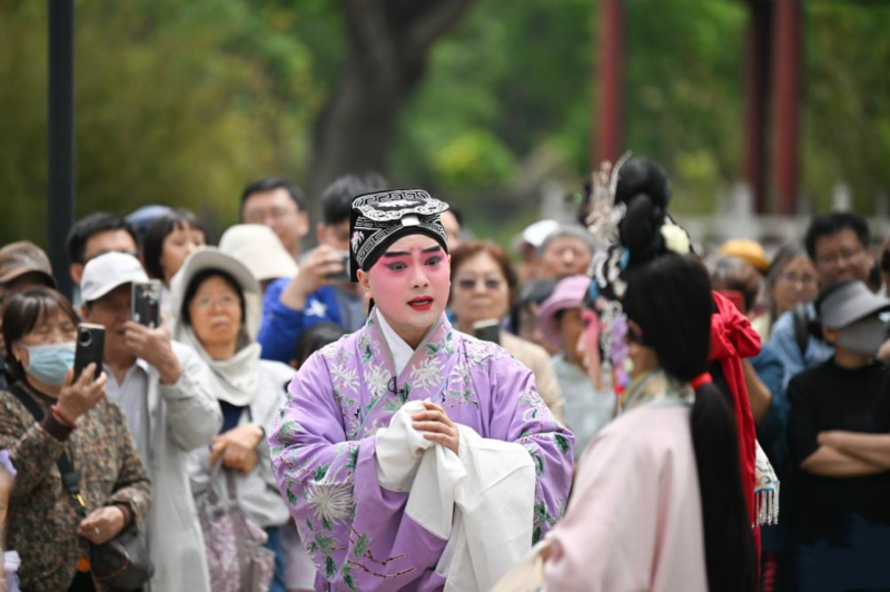 5月5日,演员在天津人民公园为观众表演京剧《西厢记》。 当日,2025“邂逅·天津——戏曲街角”携京剧《西厢记》走进拥有160多年历
