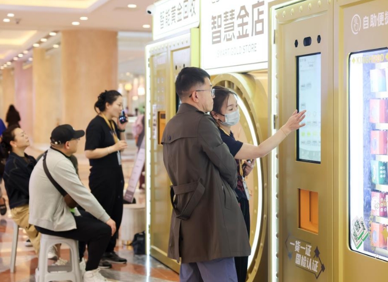 5月5日,在上海市普陀区一家商场内的“智慧金店”,工作人员为市民介绍自助黄金购买设备上的黄金商品。 近日,“智慧金店”亮相上海
