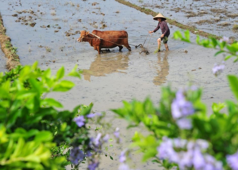 5月5日,在广西河池市罗城仫佬族自治县东门镇大福村,农民在劳作。 当日是立夏节气,各地农民抢抓农时开展农业生产,田间地头一派繁