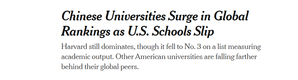 全球媒体聚焦︱美媒:全球高校科研成果排名“中升美降” 引发美国学术界担忧