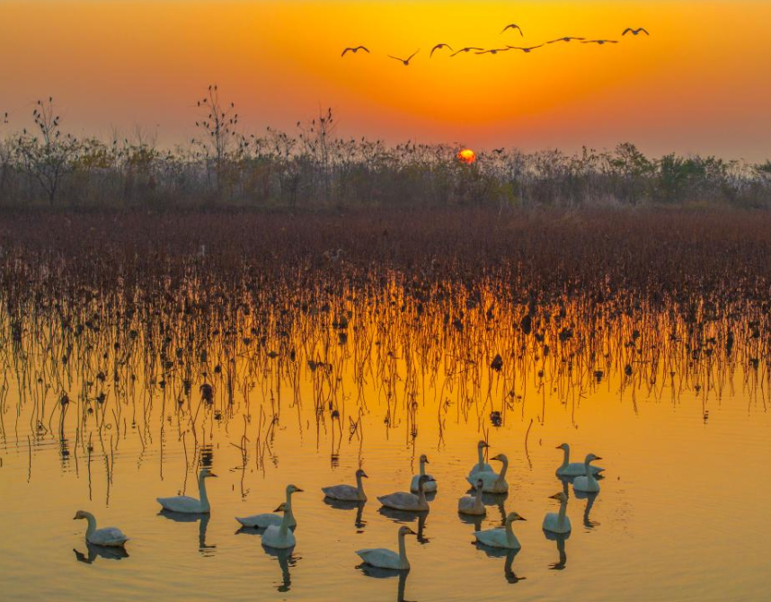 • 山东荣成北迁大天鹅结伴启程 沐浴晨光画面唯美