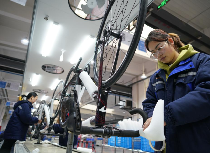 12月18日,在位于山东德州乐陵市的泰山体育产业集团有限公司的生产车间,工人在组装运动自行车。 山东省乐陵市近年来聚力发展体育产