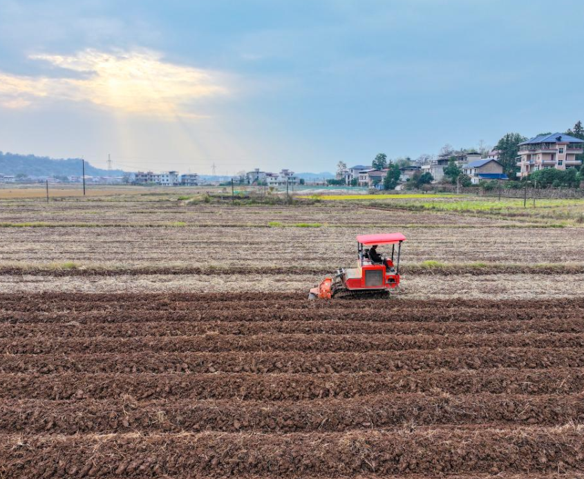 12月17日,湖南省常宁市洋泉镇农民驾驶农机在翻耕农田(无人机照片)。 冬日时节,各地农民抢抓农时,积极开展冬季农业生产活动。