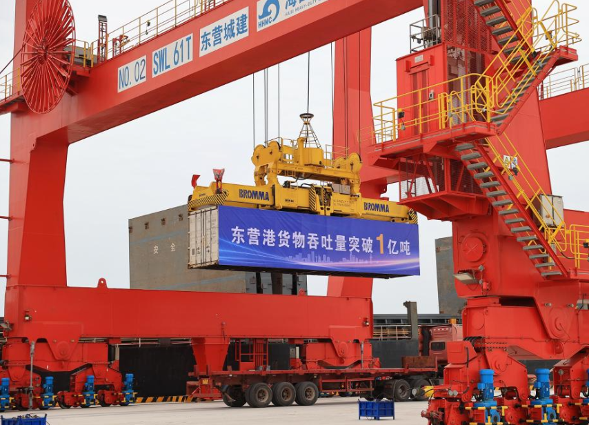 12月22日,装载集装箱的“万木春32”货轮在东营港集装箱码头停靠接卸。 12月22日,随着“万木春32”轮完成卸船作业,山东东营港2025
