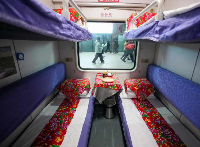 12月22日拍摄的K7041次列车的东北风情主题卧铺车厢。 12月22日,K7041次旅客列车从哈尔滨站驶出,开往漠河。这是中国铁路哈尔滨局集