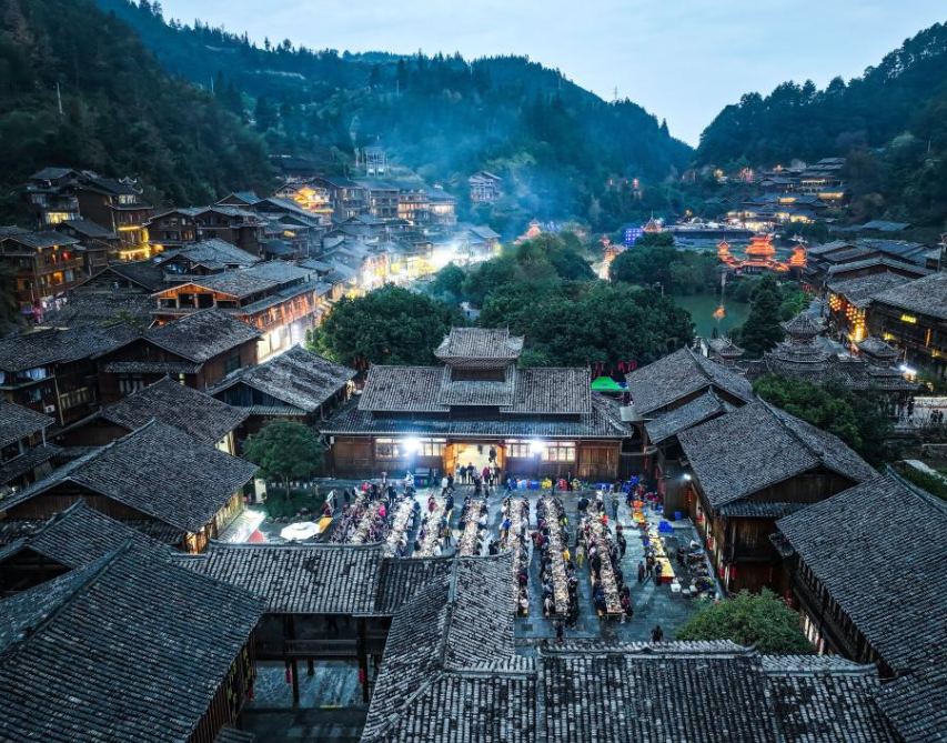 在贵州省黎平县肇兴侗寨,侗族同胞与来宾在侗年活动中共享长桌宴(12月20日摄,无人机照片)。 随着一年一度侗年的到来,位于贵州东