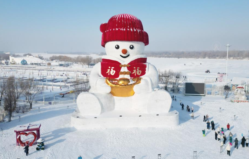 12月24日在哈尔滨外滩德嘉雪人码头冰雪景区拍摄的大雪人(无人机照片)。 近日,继太阳岛“雪人先生”、群力音乐公园大雪人之后,又