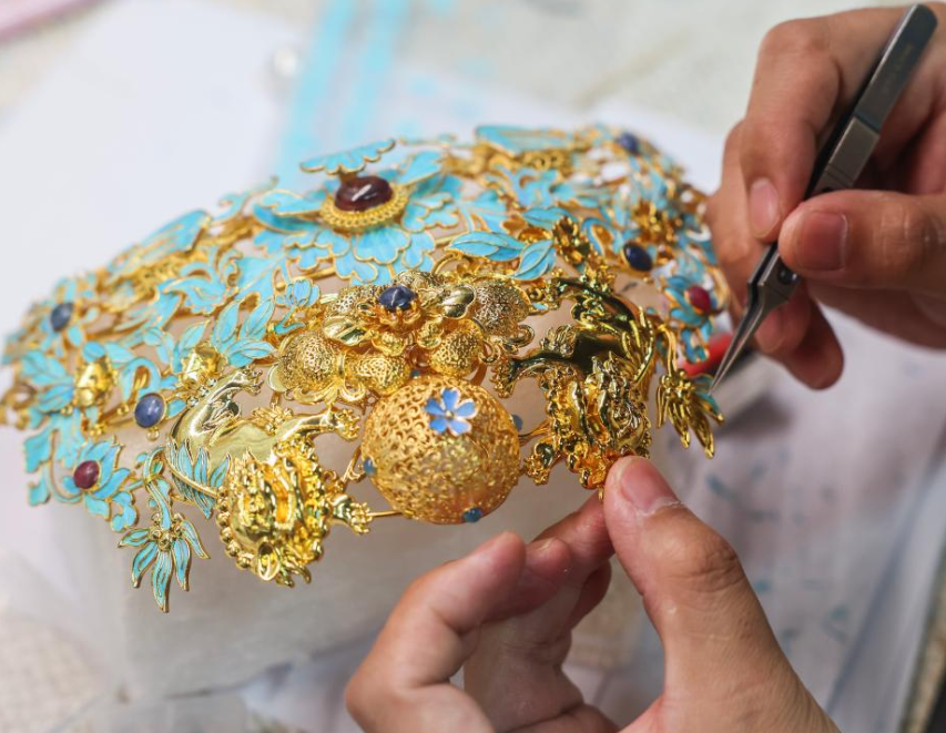 12月24日,在位于匡堰镇倡隆村的楝树下艺术村落的花丝镶嵌非遗工坊内,花丝镶嵌技艺传承人高聪在用点翠工艺制作花丝镶嵌工艺品。 近