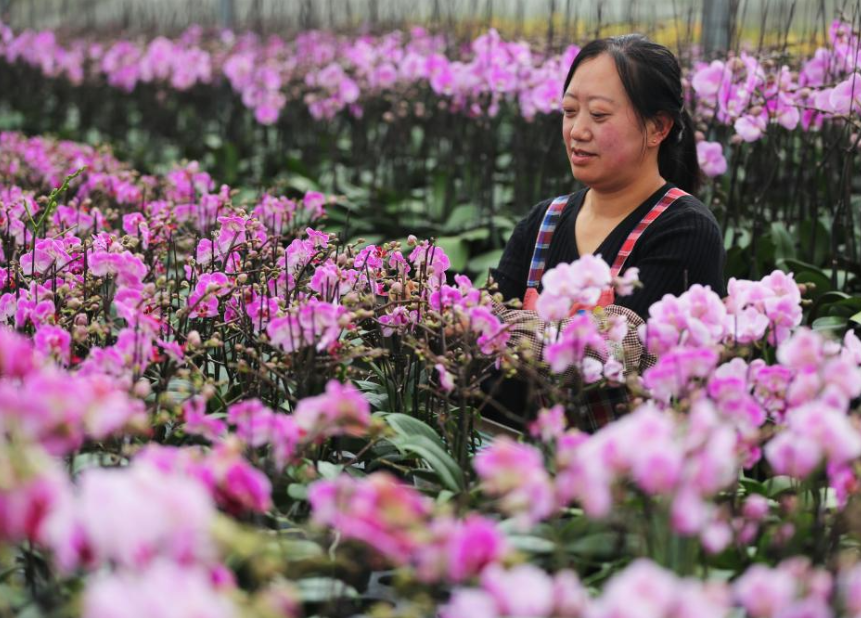12月23日,甘肃省定西市临洮县一花卉种植基地的工人在管护蝴蝶兰。 新年将至,各地迎来年宵花销售高峰,生产企业按照订单管护、外运