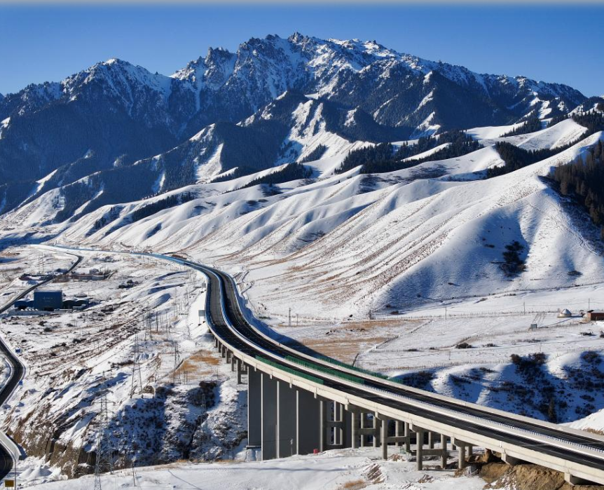 新疆乌尉高速公路蜿蜒在天山中(12月23日摄,无人机照片)。 世界最长高速公路隧道——天山胜利隧道及其所在的G0711新疆乌鲁木齐至
