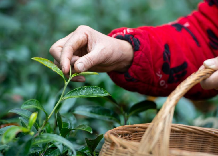 1月29日,湖北省秭归县郭家坝镇王家岭村茶农在“丝绵茶1号”茶园采摘茶叶嫩芽。  1月29日,三峡库区湖北省宜昌市秭归县“丝绵茶1号”