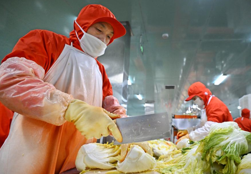 1月29日,青岛翔龙食品有限公司员工在加工销往日本市场的泡菜。  春节临近,山东省平度市出口泡菜加工企业迎来生产旺季,车间开足马
