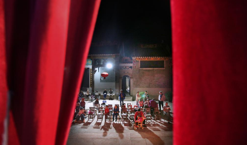 天色渐暗,村民陆续在戏台前摆凳子,准备观看演出(2月6日摄)。  2月6日至9日,南国粤剧团走进广东省鹤山市雅瑶镇隔朗村,连续四天
