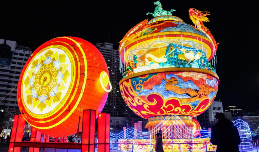这是2月10日在兰州市城关区东方红广场拍摄的“龙马精神”主题大型灯组。  2月10日,甘肃省兰州市在兰州黄河铁桥中山桥、东方红广场等