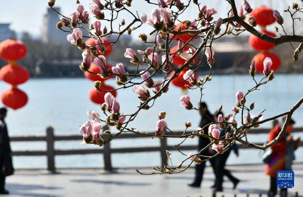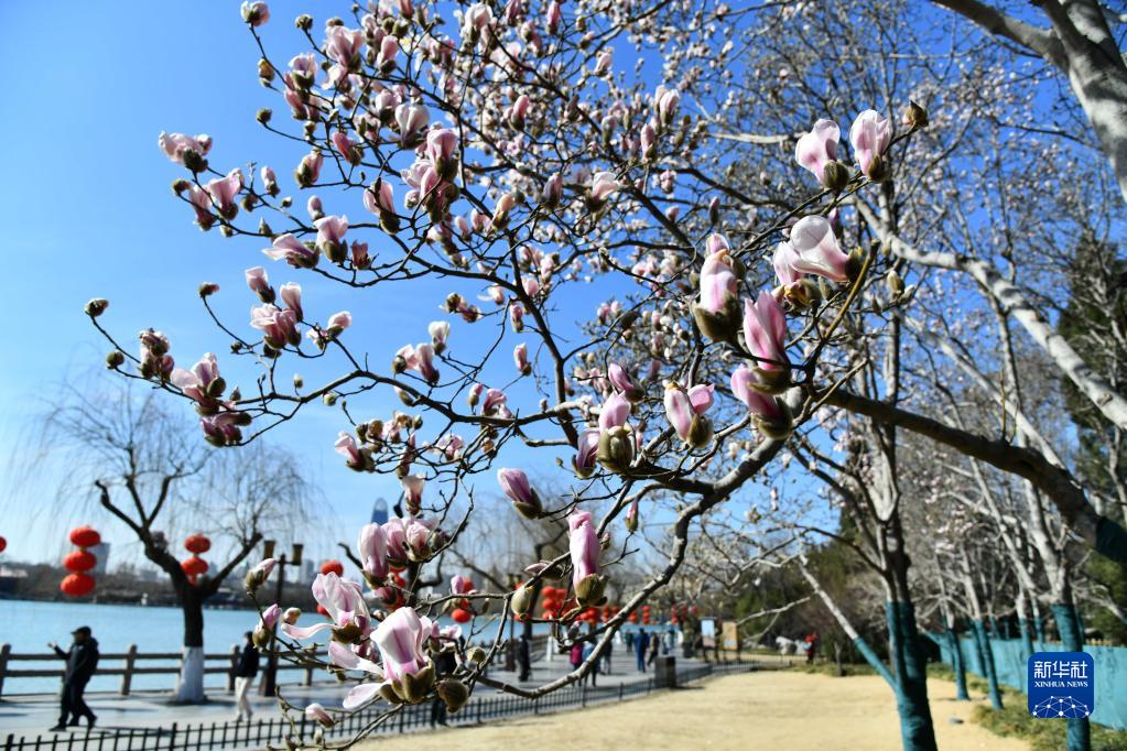 近日,山东省济南市天气晴好气温回升,大明湖景区内玉兰花陆续绽放,给城市带来了春天的气息。