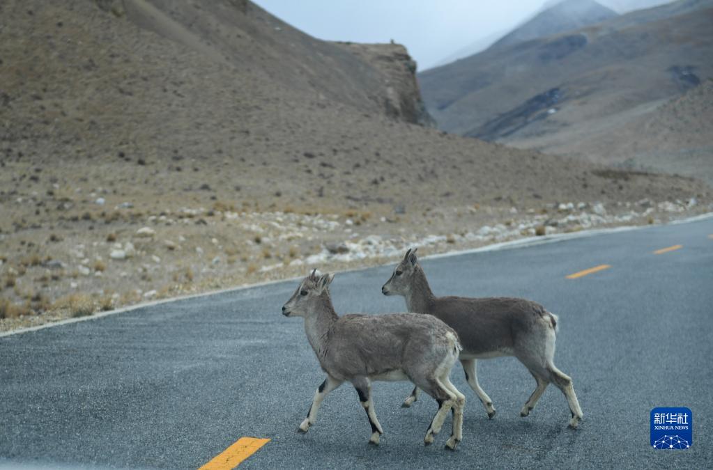 两只岩羊穿过通向珠峰大本营的公路(5月7日摄)。
