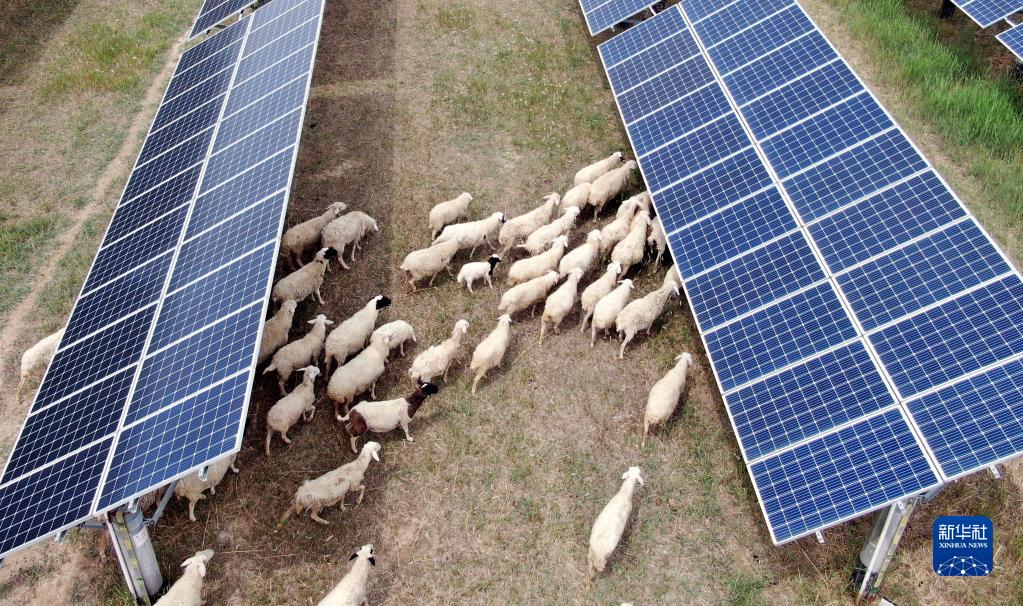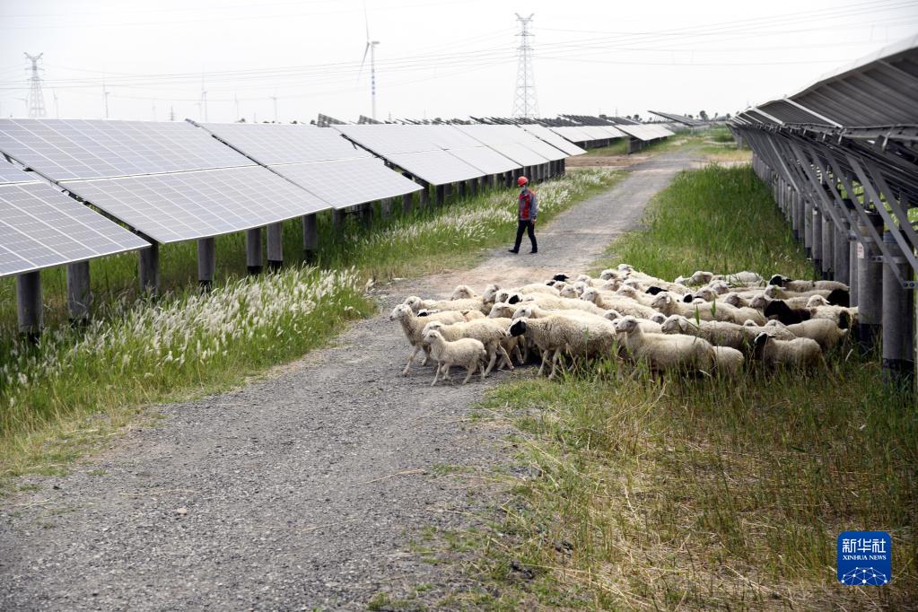 5月14日,在滨州市沾化区富源街道的华能沾化清风湖风光同场项目区,羊群在光伏板下穿行吃草。