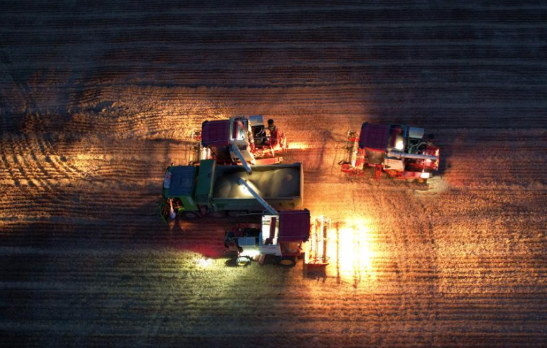 “三夏”时节,在山东省临沂市沂南县麦收现场,收割机连夜抢进度,力保颗粒归仓。