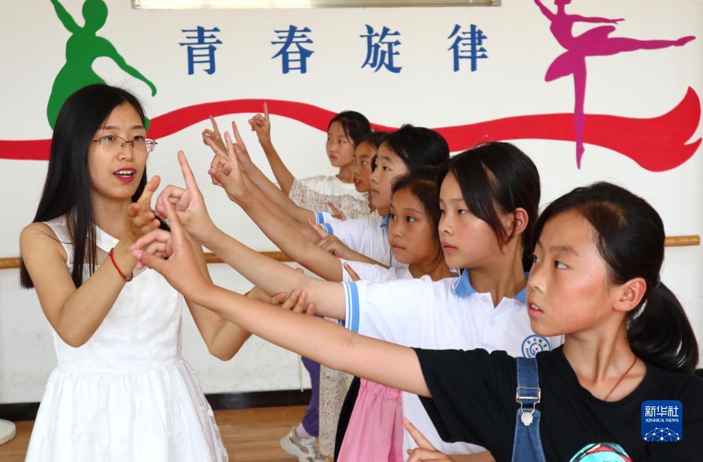 6月16日,在山东省单县黄岗镇乡村“复兴少年宫”的舞蹈活动室,少年宫辅导员崔静在指导孩子们练习舞蹈。