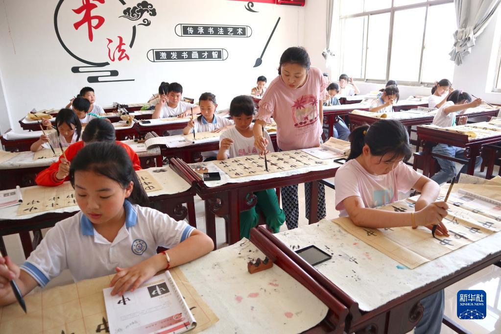 6月16日,在山东省单县黄岗镇乡村“复兴少年宫”的书法活动室,少年宫辅导员朱乙斐在指导孩子们学习写毛笔字。
