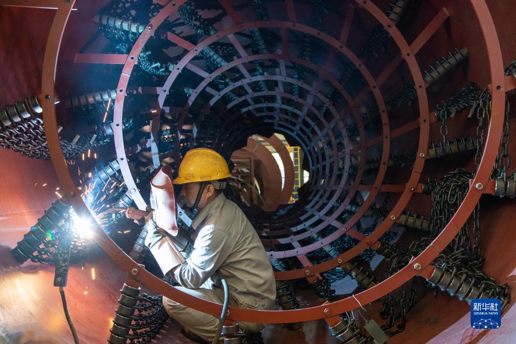 6月27日,福建省泉州市洛江区一家机械制造企业,工人焊接机械产品。新华社发(连静毅摄)