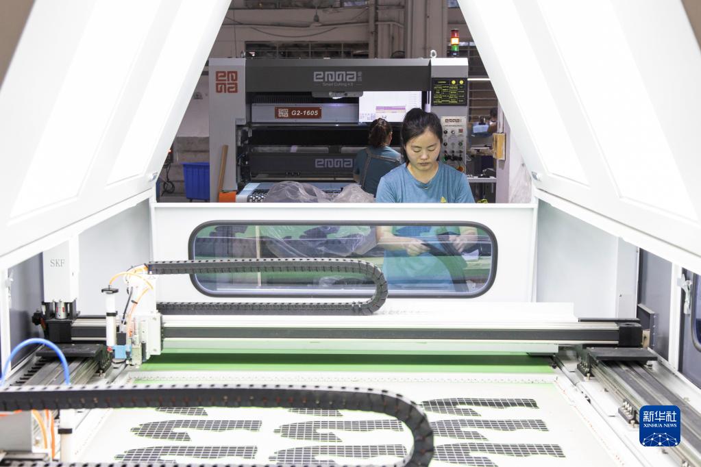 6月27日,福建省泉州市丰泽区一家制鞋企业,工人在冲裁自动印线工序操作机器。新华社发(连静毅摄)