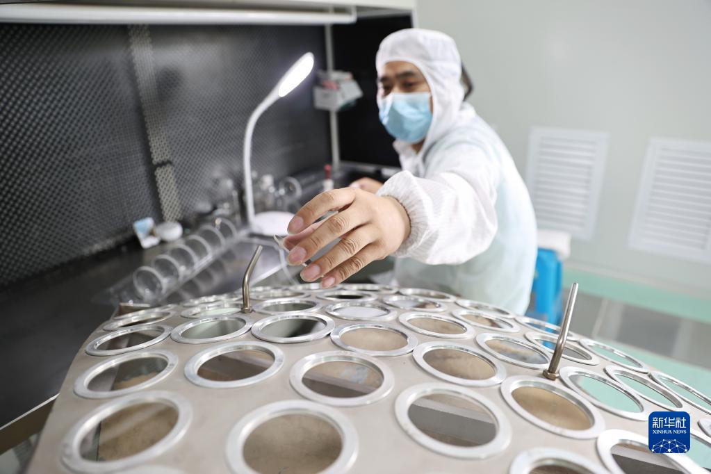 6月23日,江苏如皋一家光电科技有限公司镜片镀膜车间内,工人们检测天文望远镜镜片。新华社发(邱宇摄)